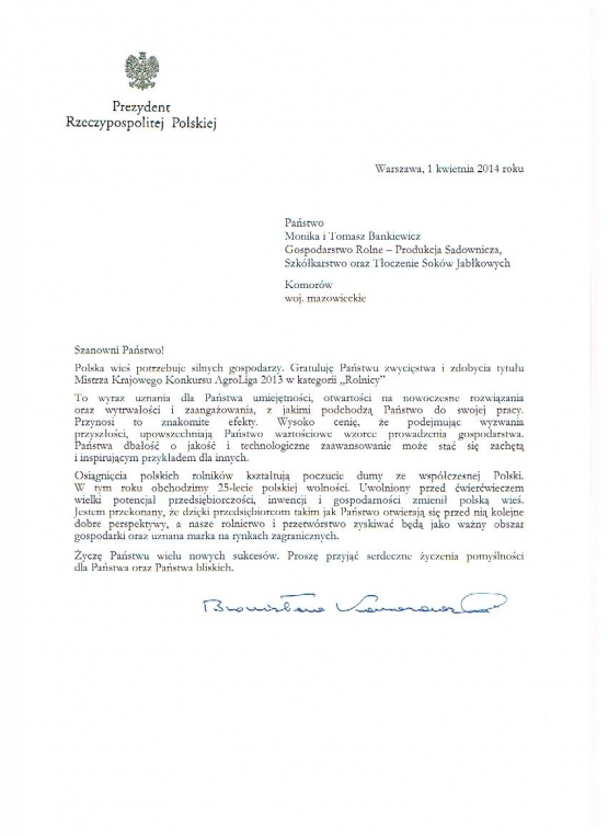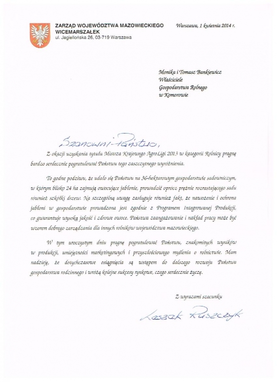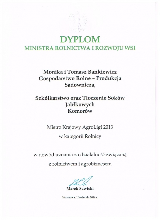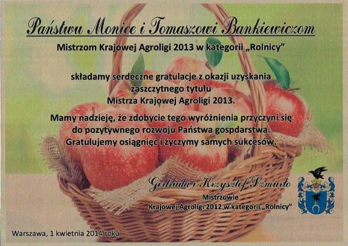 Nagrodę odebraliśmy 1 kwietnia ( to nie był pryma aprilis) z rąk Pana Prezydenta Bronisława Komorowskiego był to List Gratulacyjny w związku ze zdobyciem tytułu Mistrza Kraju AgroLigi 2013 w kategorii ROLNICY, natomiast z rąk Sekretarza Stanu Pana Kazimierza Plocke odebraliśmy piękny Puchar.